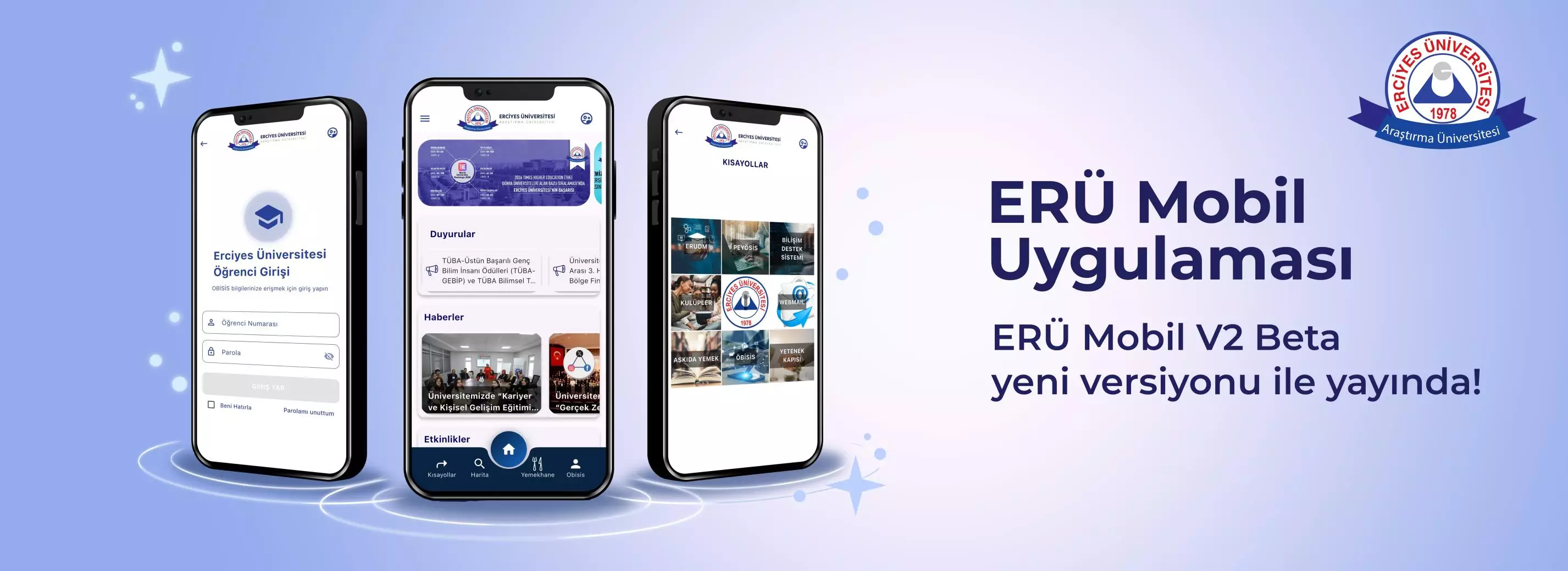 Bilgi İşlem Daire Başkanlığı tarafından geliştirilen ERÜ Mobil uygulamasının birçok yeni özellik ve optimizasyon içeren yeni versiyonu ERÜ Mobil V2 Beta yayınlanmıştır. • Yeni, güncel teknolojiler ve yeni mimari ile Erü Mobil uygulaması yenilendi. • Birçok ekranda tasarımsal değişiklikler yapıldı.